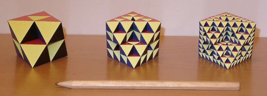 The idea of these is not that special. I guess I'm not the first who had the idea of building these. The idea is a 3D extension of Sierpinky's Sieve. The number of faces increases rapidly; the first one has 8x6=48 faces, the second phase 6 times as much, and the 3rd phase 8x6x6x6=1720 faces!
